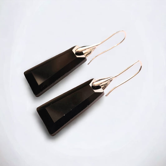 Trapezoid Obsidian Drop Earrings - Geometric Dangle Earrings, Black Gemstone Jewelry, Gold/Silver Plated, Elegant Gift for Women, Boho Chic